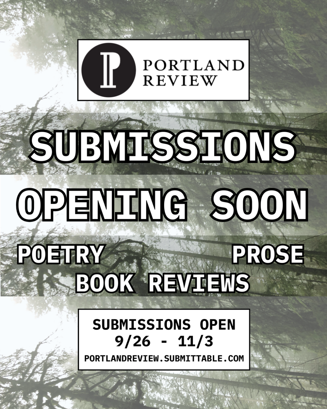 Beginning Friday, September 26, Portland Review will be open for submissions in Poetry, Fiction, Creative Nonfiction, and Book Reviews. The window for submission will close on Monday, November 3, but we may close the submission for a genre early if we reach our cap before the official closing date.